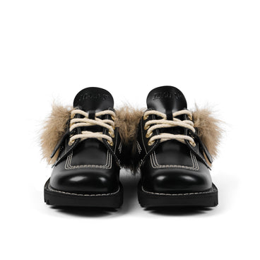 The Kick Mule, designed by Mains in collaboration with Kickers. A fresh take on the iconic Kick Hi, this ultra clean mule features co-branded detailing on the tongue and lace eyelets. Crafted in premium leather with faux fur trim. Taking cues from the classroom built for lessons learnt beyond it.